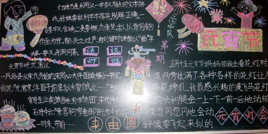 本期板报能针对新学期 新气象、欢庆元宵节展开主题内容,让学生以崭新的姿态迎接新学期的到来,渗透元宵节吃元宵、闹花灯、猜灯谜等传统文化的思想教育。