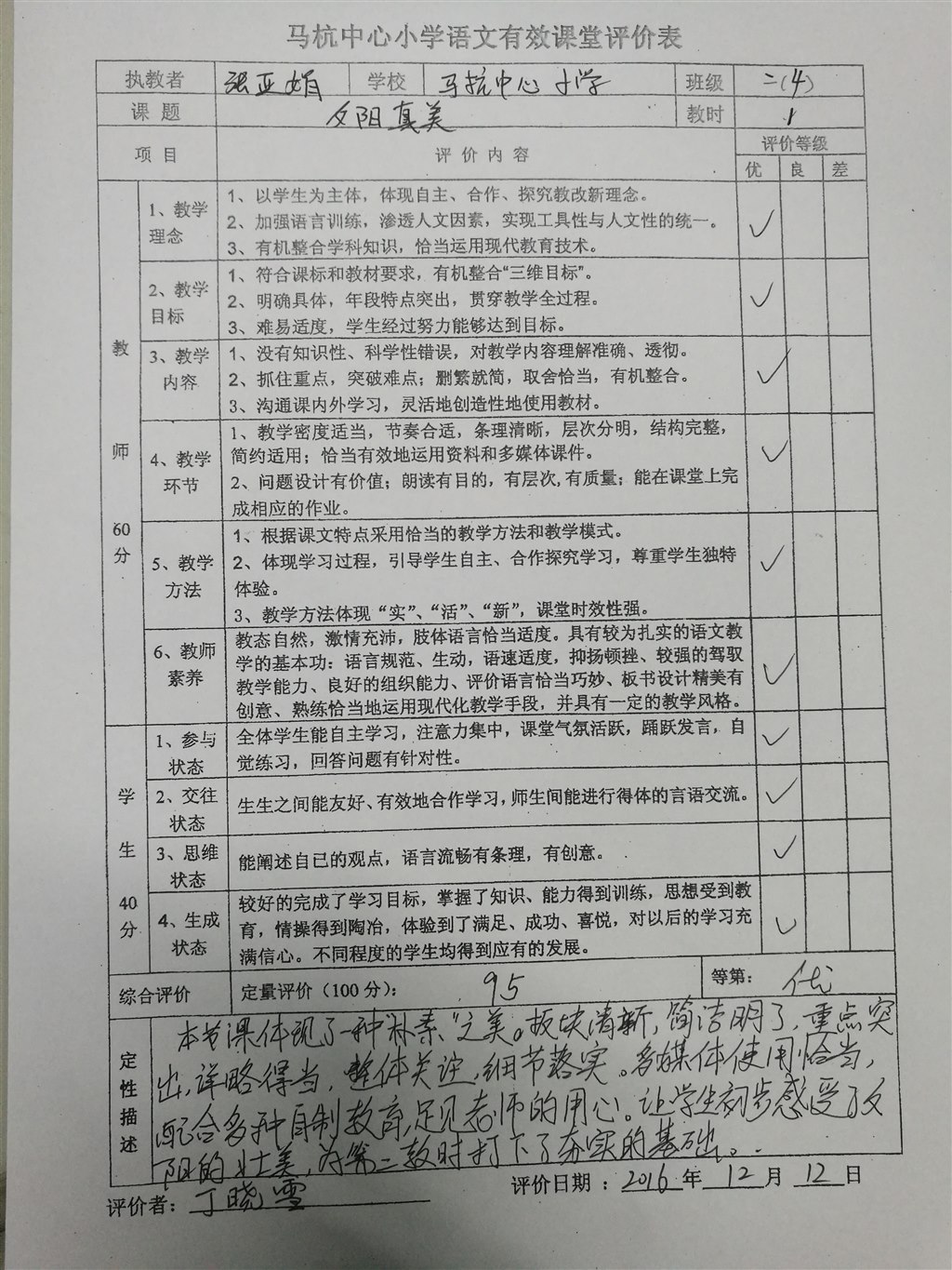 随后,张亚娟老师给大家带来的《夕阳真美》也让人刮目相看。张老师也用谜语引入课题,整个教学中,按照“西斜—下沉—落山”的顺序,紧扣重点词,进行朗读训练,对于词语的处理不仅扎实而且十分灵活,劲儿让孩子们真真切切地体验到夕阳下蓝天的美和西山的壮丽。课堂中,张老师还注重采用不同形式的读,力求调动学生读书兴趣,使学生意识到自己酿的蜜最甜。正如课标中提出“要让学生充分地读,在读中整体感知,在读中有所感悟,在读中培养语感,在读中受到感情熏陶。”张老师的课生动而又入情。