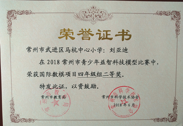 刘亚迪获常州市数棋比赛四年级组二等奖
