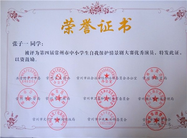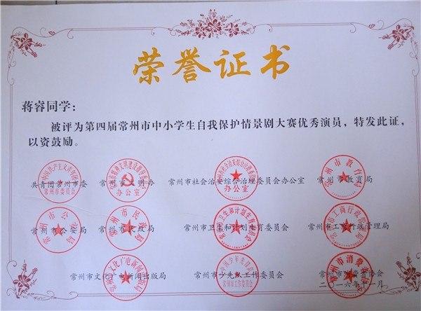 张子一、蒋睿同学被评为第四届常州市中小学生自我保护情景剧大赛优秀演员