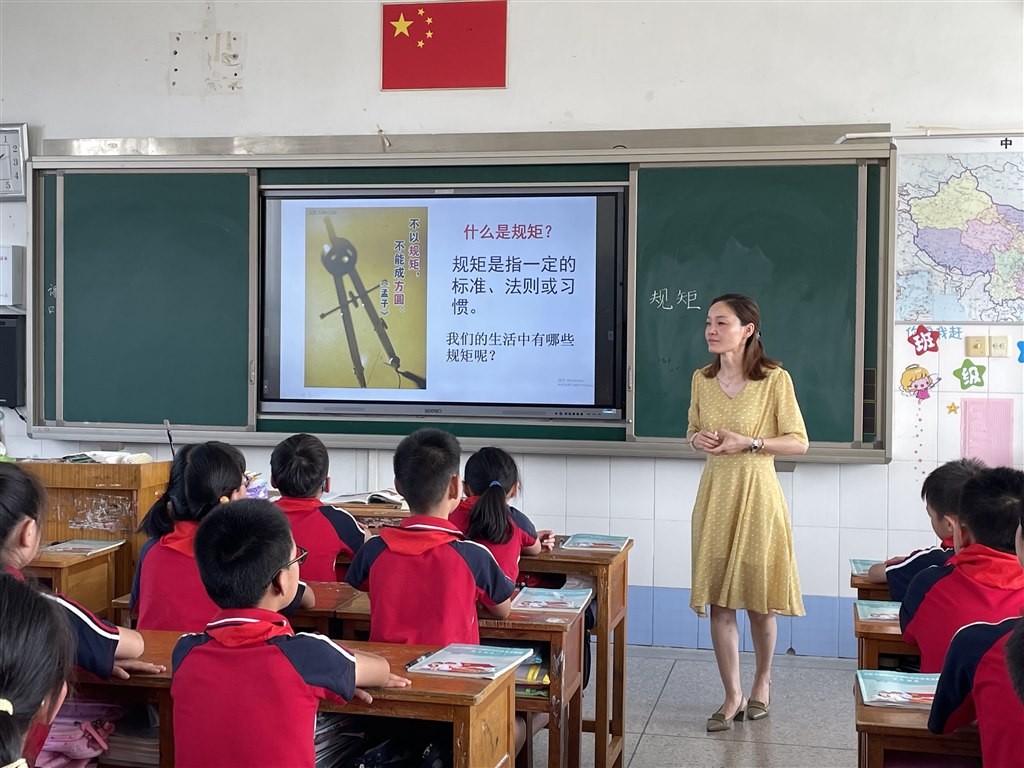 聆听一堂示范课。今天上示范课的是张晓丹老师。她以五年级的法制教育读本为蓝本,精心设计和执教了《立规矩、讲规矩、守规矩》一课。课以解读孟子“不以规矩,不能成方圆。”始,通过生活场景定义规矩;自学《小学生日常行为守则》立好班规;情景辨析讲规矩;听宪法宣讲做守规矩进行,最后以习近平总书记的话结尾。层层推进,浑然一体。学生在课堂的积极参与对话、活动,不仅认识了规矩,也对法律有了更深的认识。
