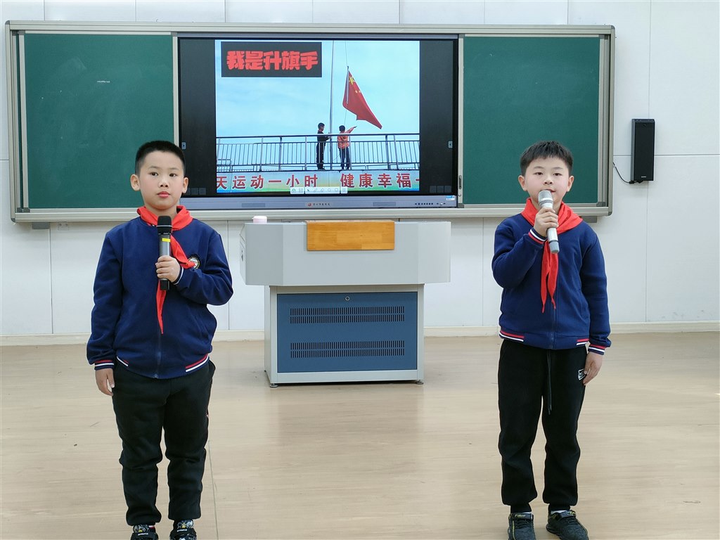 主持人1:国旗有革命的火焰,有共和国的荣耀!它是我们的爱国心。托举起国旗,他们是当之无愧的爱国小先生。