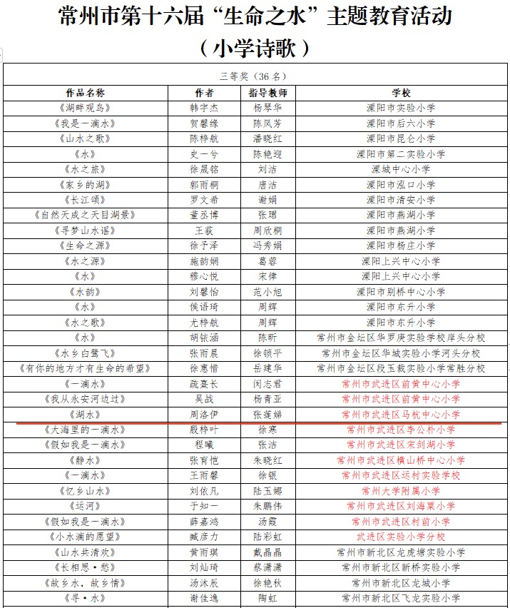 祝贺我校学生和老师在常州市第十六届“生命之水”主题教育活动中获奖