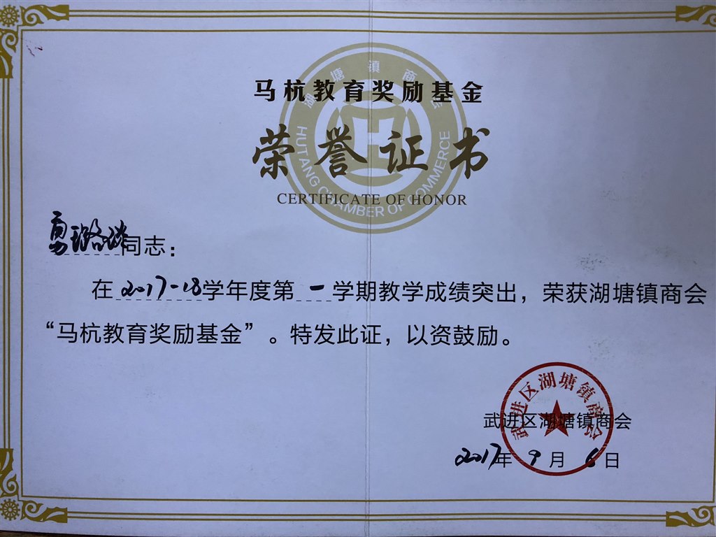 勇璐琰老师获2017湖塘镇商会“马杭教育奖励基金”
