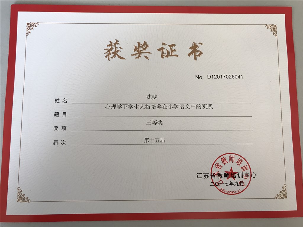 沈斐老师论文《心理学下学生人格培养在小学语文中的实践》获第十五届蓝天杯三等奖