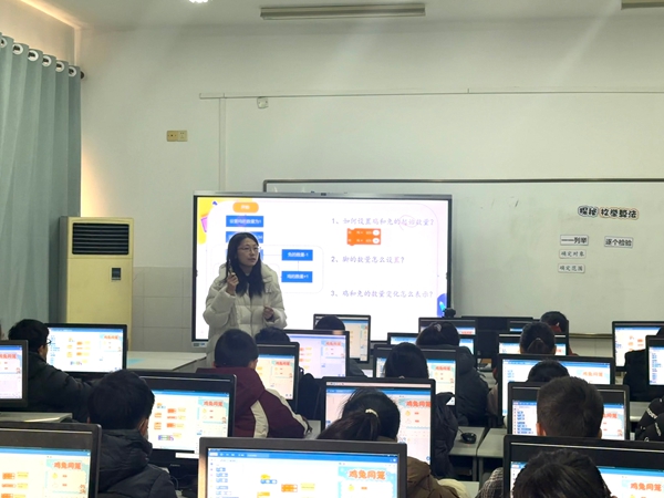 教学展示环节,王烨老师执教《探秘枚举算法》,以经典的数学问题“鸡兔同笼”为情境,通过数据枚举我会列、算法描述我会说、算法模型我会搭、脚本编写我能行等环节,引导学生列数据初识枚举,分别用自然语言和流程图描述算法理解枚举,最后用程序验证算法,层层递进,促进学生掌握枚举算法“有序列举、逐一检验”的核心原理。