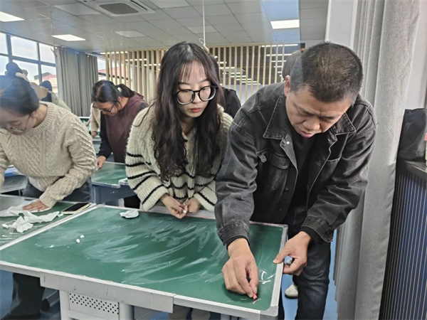 第八周,40 周岁以下教师齐聚观摩室,参与 “粉笔字技法与板书” 专项培训。书法教育专家许波老师从粉笔特性、执笔姿势入手,细致示范汉字起笔、行笔、收笔要领,指导教师把握汉字结构、融入书法韵味。老师们在临摹实践中相互借鉴、交流心得,有效提升了粉笔字书写水平与板书设计素养,为课堂教学增添别样光彩。