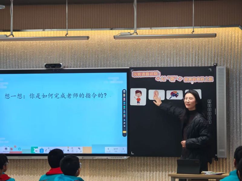 西园实验小学薛瑞老师执教了五年级上册《玩转语音识别:AI“听”世界的奇妙之旅》一课。课堂以“与小爱同学对话”为情境导入,通过“指挥官—士兵”游戏引导学生对比理解人与机器识别语音的相似过程,生动展示了“获取—处理—输出”的技术逻辑。在探究环节,薛老师组织学生开展声波采集与特征匹配实验,将抽象的“特征提取”与“模型匹配”转化为可观察、可操作的实践活动。学生通过体验智能风扇、语音鼠标等设备,在真实应用中感受技术价值,充分激发了学习兴趣。