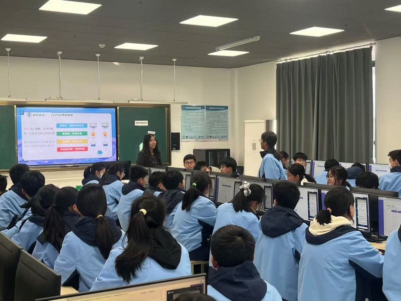 海湖实验学校徐铭媛老师呈现了七年级上册《探索2 数据的传输过程》一课。徐老师以“网络工程师考核”为任务主线,将TCP/IP协议、IP地址、数据分包、安全传输等核心知识融入实操挑战。教学中,徐老师自主设计了融合式交互学习网页,并嵌入AI智能体“数据传输小助手”,支持学生自主探究与实时答疑。通过“快递运输”类比理解协议分层、CMD查询IP地址、网页模拟对比HTTP与HTTPS安全性等环节,学生在实践中培养了网络思维与安全意识。