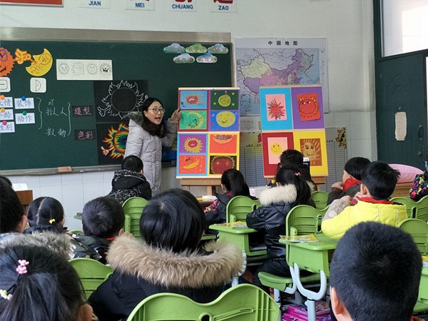首先,由王飞老师执教一年级《太阳和月亮》,本课定位于本学期教学中承上启下的一课。课前以听故事导入,用听的方式既能让低年级学生快速进入上课状态,又能让他们充分展开想象,不受任何图片的干扰。接着以甲骨文的形式引出日、月俩字,让学生感受字源演变的过程,紧接着通过走进博物馆环节讲解古时候人们对日、月的崇拜、敬畏,顺势揭示本课课题。新授环节通过两个问题引出本课的重点——拟人和拟物的造型方法,并通过范画讲解,解决本课难点——太阳光芒的多种表现方式。最后以太阳和月亮发生的故事作为拓展,为下一课做铺垫。