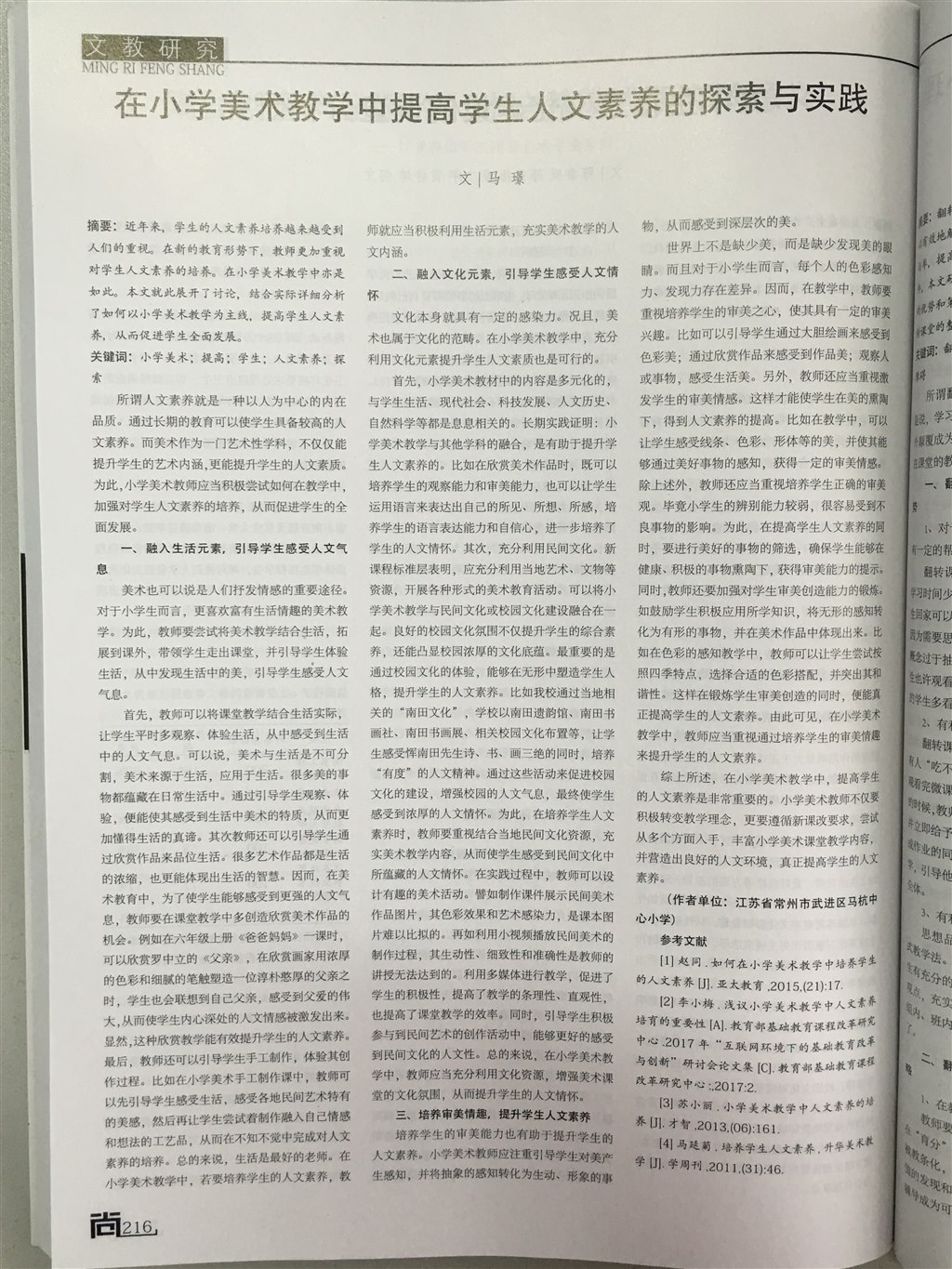 马璟发表论文《在小学美术教学中提高学生人文素养的探索与研究》